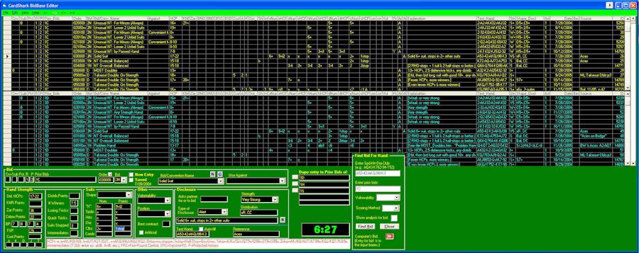 As discussed in BidBase Background, the BidBase Practice program, the Hand Evaluation program, and even the Bid Simulator are fairly easy-to-use programs, but the first look (and even many looks after that) at the BidBase Editor can be daunting. (Click for even more daunting [bigger] image, but don't do it in BidBase File Viewer/Editor. Sorry.)