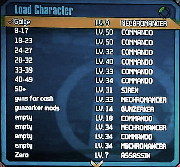 In the image below, Gaige is the current character and the others are characters from previous playthroughs which have been renamed to indicate the level of the weapons they are holding. Don't worry if you only have one or two previous characters. That's all you need to get started. This list started with one and grew from there. I had played several characters and deleted them before thinking of the armory. They would have come in handy when I started the armory, so don't make my mistake.