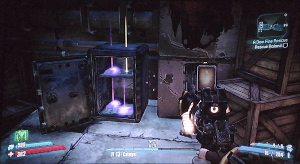 Hey! Over Here: Back in Fyrestone, go to the building on the left with the ammo vending machine. Climb up the rocks around the right side and continue up to find the old Claptrap and a loot chest.