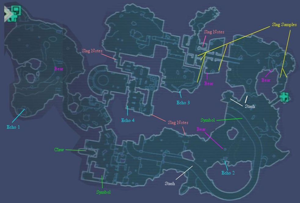 10 Slag samples are pretty easy to find, so they are not mentioned below. The first 6 are shown on the map, and the last 4 are in the last couple of rooms near the end, so they aren't even shown on the map. If you are farming the Loot Box Midgets before continuing the mission, you will pass a couple of slag samples each time you make a farming run. They respawn and you can get all 10 if you do at least 5 farming runs.