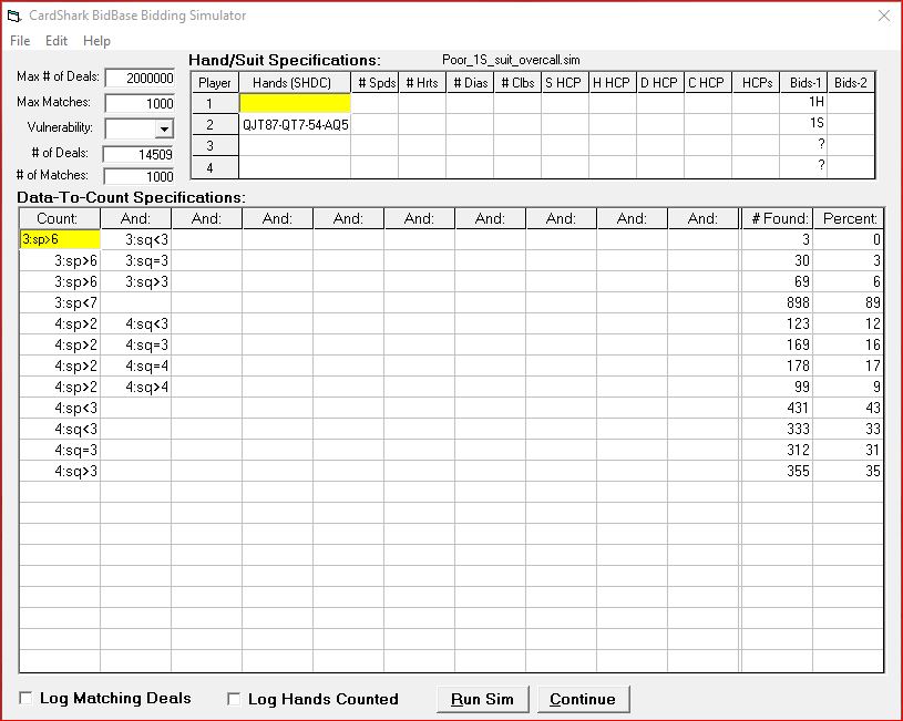When a deal matches the specs and bids in the Specifications grid, BidSim then analyzes the hands and increments the counters where matches are found to your entries in the Count grid.