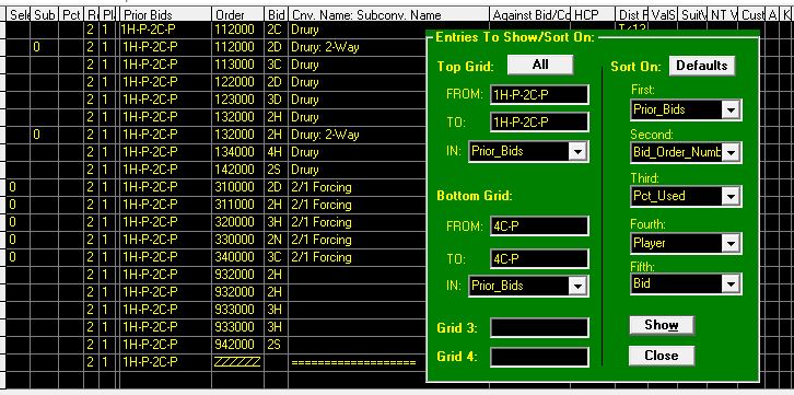 If you are using one grid and viewing the set of bids with Prior Bids of 1C-P-1H, then pressing Ctrl-J or clicking on => will cause the entries with prior bids of 1C-P-1S to be displayed.