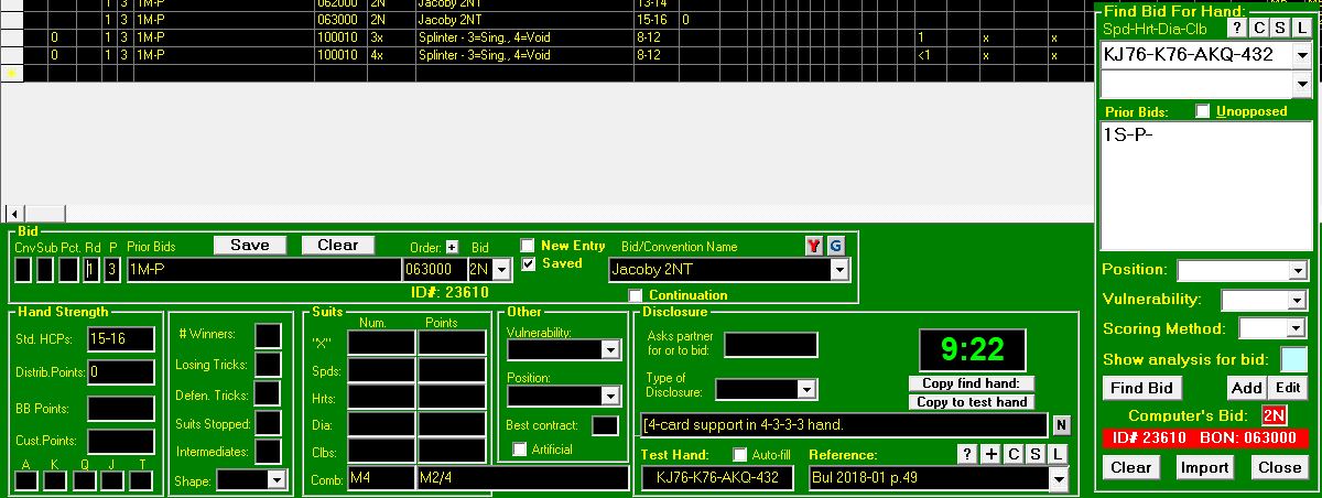 When done, click on Find to find a bid for the imported hand and prior bids to make sure it comes up with your new/edited entry.