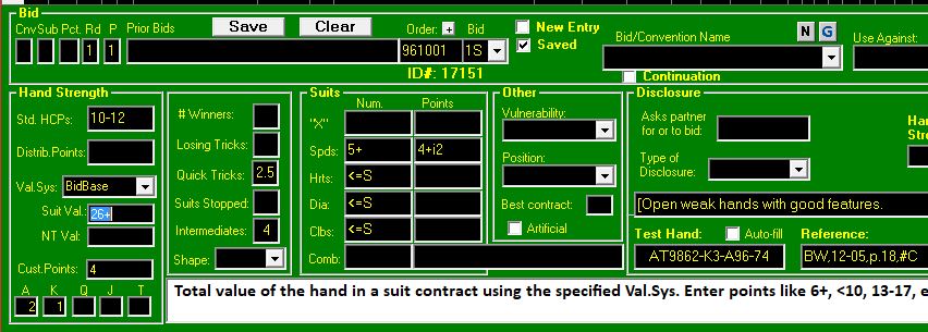 Help MenuSystem Info Files (Ctrl-I)Each system has an information file which has been extracted from the system creator's original file(s) so that we can link each entry to the creator's specifications. The file will open up to information about the entry you are on in the grid. If you open an info file and press Ctrl-I again for the same system, a new viewing window will open, so you may end up with multiple file viewers open. Each info file also contains a link to the system creator's original web files and web site, when available. When a calculation has been done for an entered hand, the Value Points, if any, for each entry in the system, are shown in the VP column at the right of the grid. To see an explanation for an entry, look in the system's info file for the entry's ID. Evaluate A HandCurrent HandTo evaluate a hand for an opening bid: Here are some features which make entering hands easier: While pasting in a hand may circumvent the immediate validity testing, such testing is done again before a computation is done. Players' HandsValuation systems which do not take other players' bids into account are basically only good for opening bid evaluation. This observation is not intended to denigrate such systems, because they contain many good ideas for evaluating hands, but the fact is that subsequent bidding does affect the initial valuation, and cannot be ignored in a complete valuation system. Normally, a bridge program would examine the bidding and deduce the other player's strength and distribution to the extent possible. In the BidBase bidding program, from which this program was extracted, that is what is done. Since we don't have a bidding database to draw on (that program is not ready for prime time yet), we need you to enter the the strength and suit lengths which would be indicated by the bidding. Normally, the program can get data about the current hand from the cards entered. However, if necessary, you can override the program's analysis of the current hand by entering suit lengths, Help suits, Fit suits, etc., manually as you do for other hands. Hand Strength: Enter the minimum expected strength of the hand for a bid by selecting from the drop-down list box. If a bid may be made with different strengths of hands depending on different factors, select the minimum expected strength and use it for all entries for the same bid, even though the criteria for other entries may specify a stronger hand. For example, a takeout double ("TOX") usually promises support for each unbid suit and about opening strength or greater. But with a very strong hand, you could TOX with a one-suited hand, intending to bid your suit over any response by partner. But neither your partner nor opponents are entitled to know exactly which type or strength of hand a specific TOX is based on. When partner makes a TOX, you start off playing him for about opening strength, until subsequent bidding proves otherwise. So you would enter O to indicate an Opening strength hand. Below are the strength levels used, the point ranges shown are approximations, hence some overlaps. If you open 1NT with 12-14 HCPs, for example, you would have to enter O, since that is the closest range. Also note that these points are can be HCPs, but are not necessarily. More often, they will be the playing strength (or Total Points) of a hand.