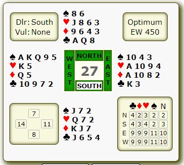 Bidding (Dealer=North): 2 East's Limit Raise Cue Bid normally shows 4-card support, but otherwise seemed to be the most accurate. West's Losing Trick Count: S=0 + H=0 + D=3 + C=3 = 6