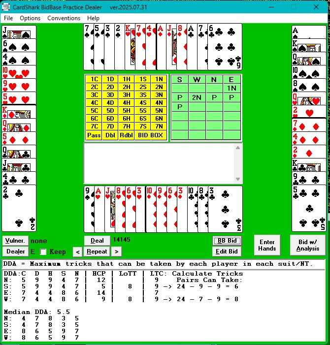 In this deal, south has 15 HCP and north has a balanced 10 HCP - an automatic jump to 3N for almost everyone, yet a 100-iteration DDA average shows that NS can only make 1N.