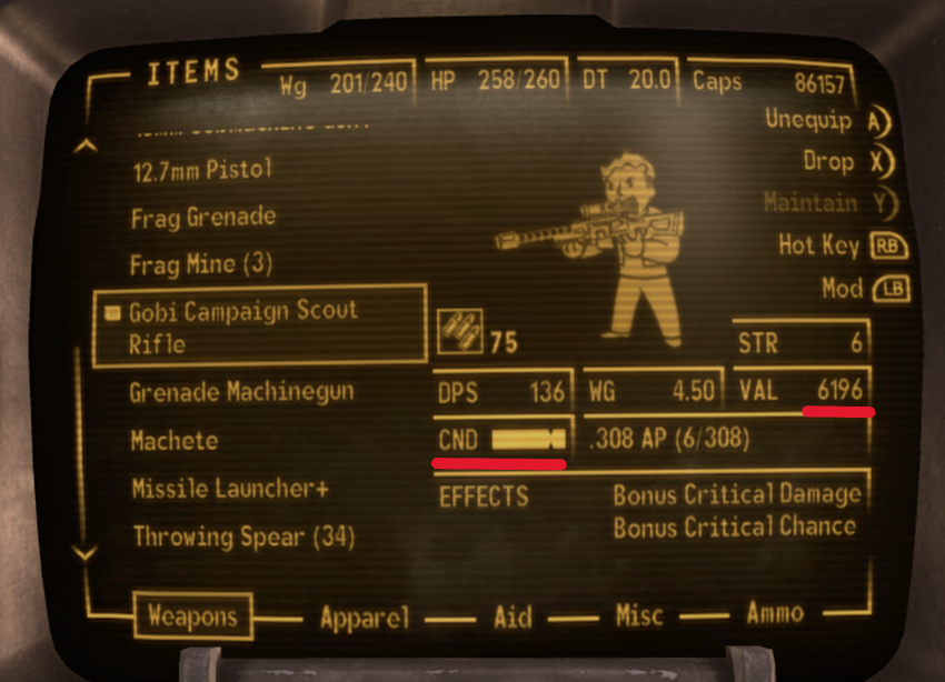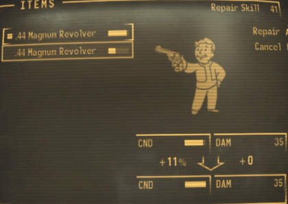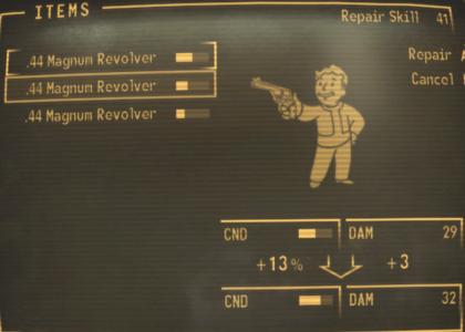 There are times when you amass a lot of weapons which you would like to sell to raise caps, but they have been worn down to a low value. Or you may get a weapon you want to use but it is in poor condition and not doing maximum damage. Either way, you have options for repairing your weapons. (Note: Weapons worn down to 0 condition cannot be repaired by you.)